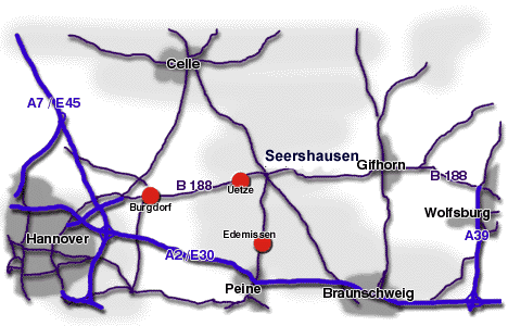 Autobahnabfahrt Peine (zw. Braunschweig & Hannover) Richtung Celle abfahren (B 144) – bis Kreuzung mit B 188 (hinter Eltze) – auf die B 188 Richtung Gifhorn/Wolfsburg –
